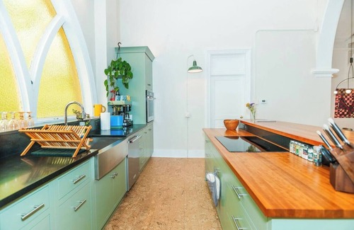 From the spacious living area, you will quickly notice the chancel has been converted into a stunning and modern kitchen boasting a induction stovetop, updated cabinetry, and all of the conveniences to accommodate guests who love to cook for a short or longer-term stay. Just down-step from the kitchen chancel area is a large dining table with lovely modern light fixtures, as well as high chairs available for tiny guests.