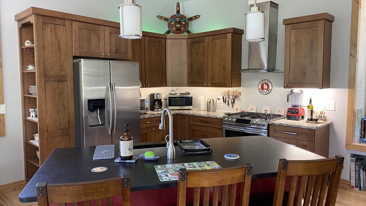 The kitchen has all modern appliances and lots of fun cooking gadgets. There is a grill on the upper deck for you to use. There are spices and condiments for your use. There is a Keurig Coffee maker and pods are provided including decaf.