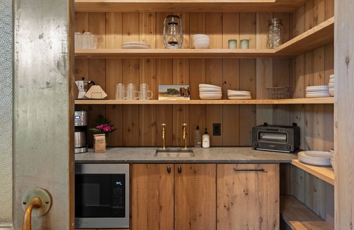As you enter, you'll be greeted by a spacious, modern yet rustic atmosphere perfect for relaxation and connection. The open-concept living room, filled with natural light, features high ceilings, tasteful decor, and a large wood-burning fireplace, creating a cozy ambiance for family and friends. The gourmet kitchen, equipped with top-of-the-line appliances and ample counter space, is a chef's delight, complemented by a separate butler's pantry with a coffee bar. If desired, a private chef can prepare meals during your stay!